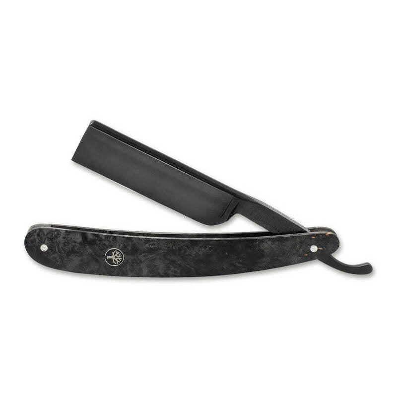 Lo stile non è tanto una questione di eleganza quanto di carattere. La Boker Black Amboina dimostra alla perfezione che queste caratteristiche possono essere perfettamente combinate. L'espressivo rasoio da 6/8 pollici è completamente nero con una lama brunita realizzata per la prima volta in acciaio al carbonio ad alta resistenza. In questo speciale processo, la superficie della lama viene trasformata in uno strato di ossido nero mediante trattamento con acido, motivo per cui non è possibile parlare di rivestimento in senso classico. La lama rettificata extra alta presenta delle scanalature su entrambi i lati e sottolinea così il carattere esclusivo della Boker Black Amboina.