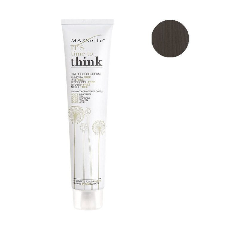 Think è la colorazione di nuova generazione di Maxxelle in grado di coprire il 100% del 100% dei capelli bianchi rendendo il trattamento il più naturale possibile perché privo di ammoniaca, PPD (Para-fenilendiamina), resorcina, e parabeni.