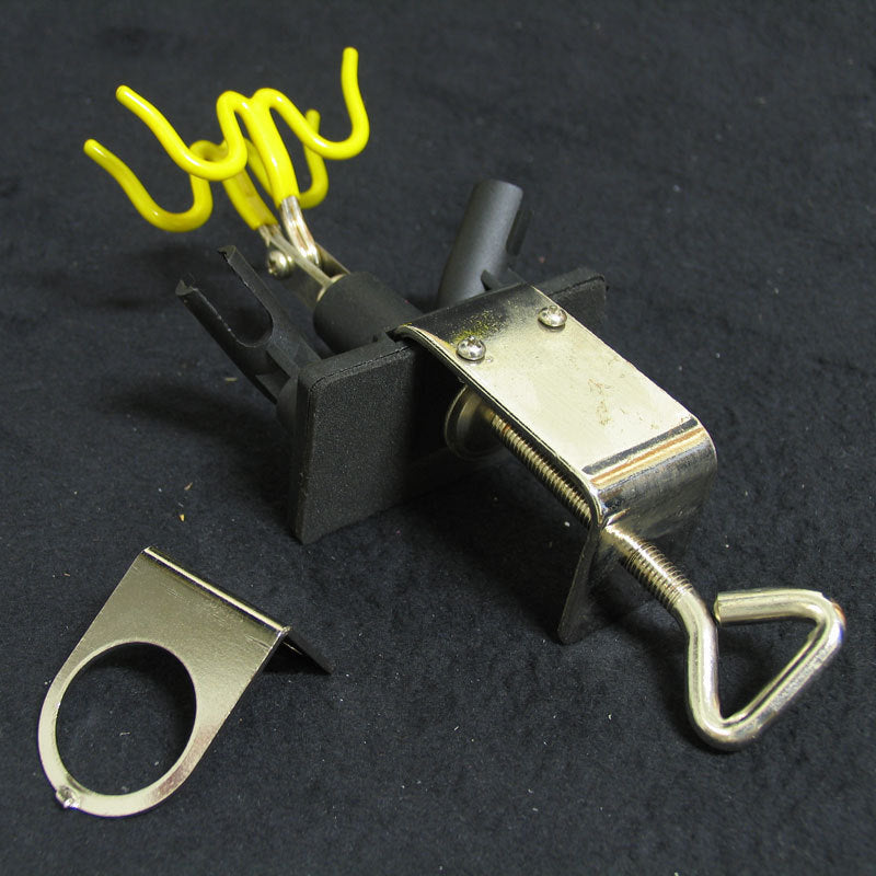 Questo pratico porta pistole per aerografo è dotato di un morsetto a vite che permette di fissare l'attrezzo al tavolo di lavoro. I supporti mobili permettono di appoggiare fino a 4 pistole contemporaneamente.