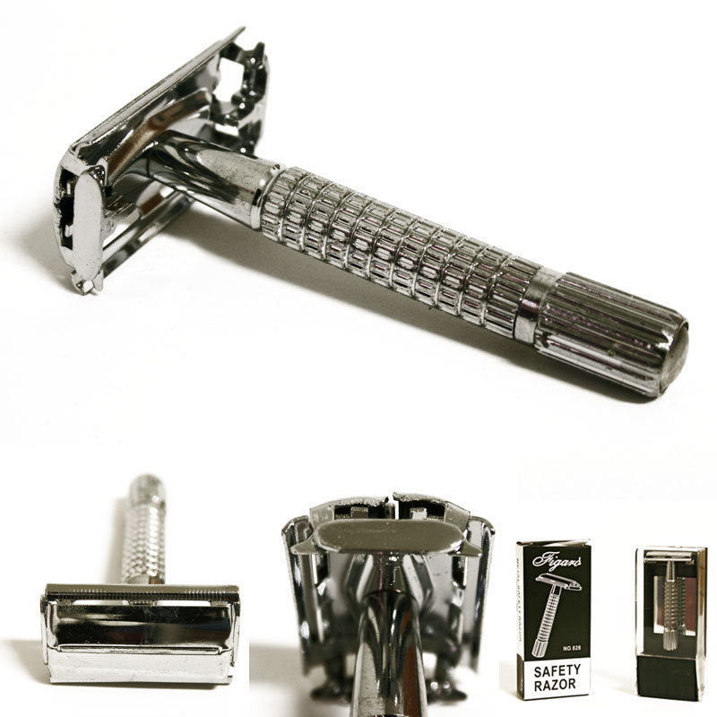 Economico rasoio di sicurezza Figarò con apertura a farfalla realizzato in metallo cromat. Dotato di astuccio rigido in materiale plastico con specchietto e scomparto per 1 pacchetto di lame da barba più spazio per riporre eventuali lame esauste.