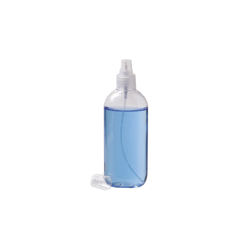 Flacone in plastica trasparente per liquidi con dispencer per erogazione spray.