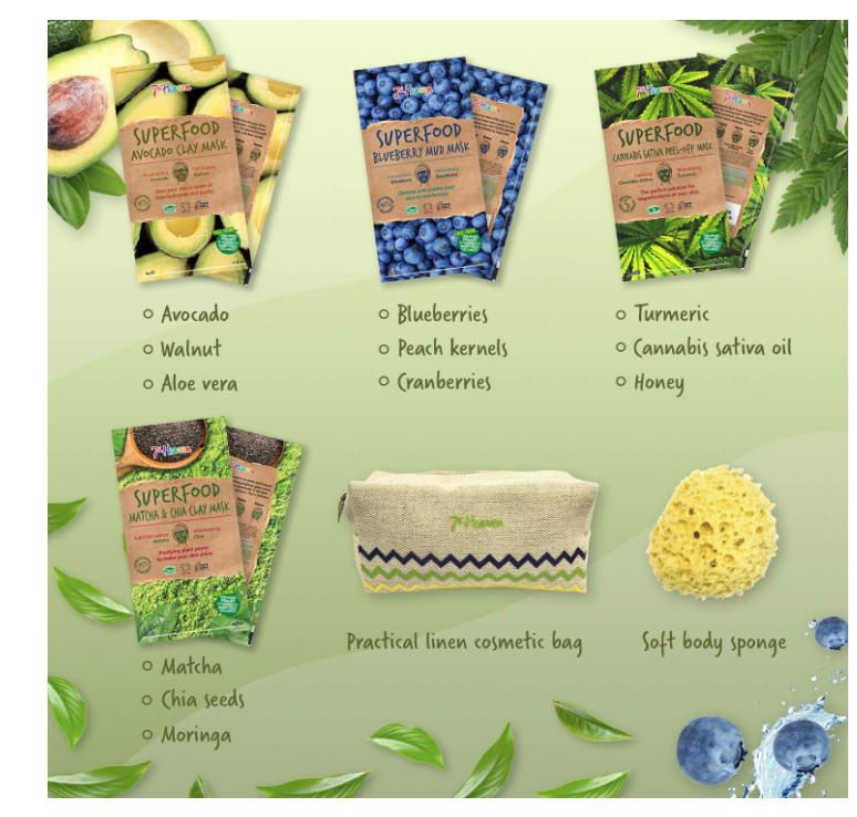 Pochette in lino con 4 maschere viso monodose e spugna corpo – 7th Heaven Superfood Skincare Gift Set